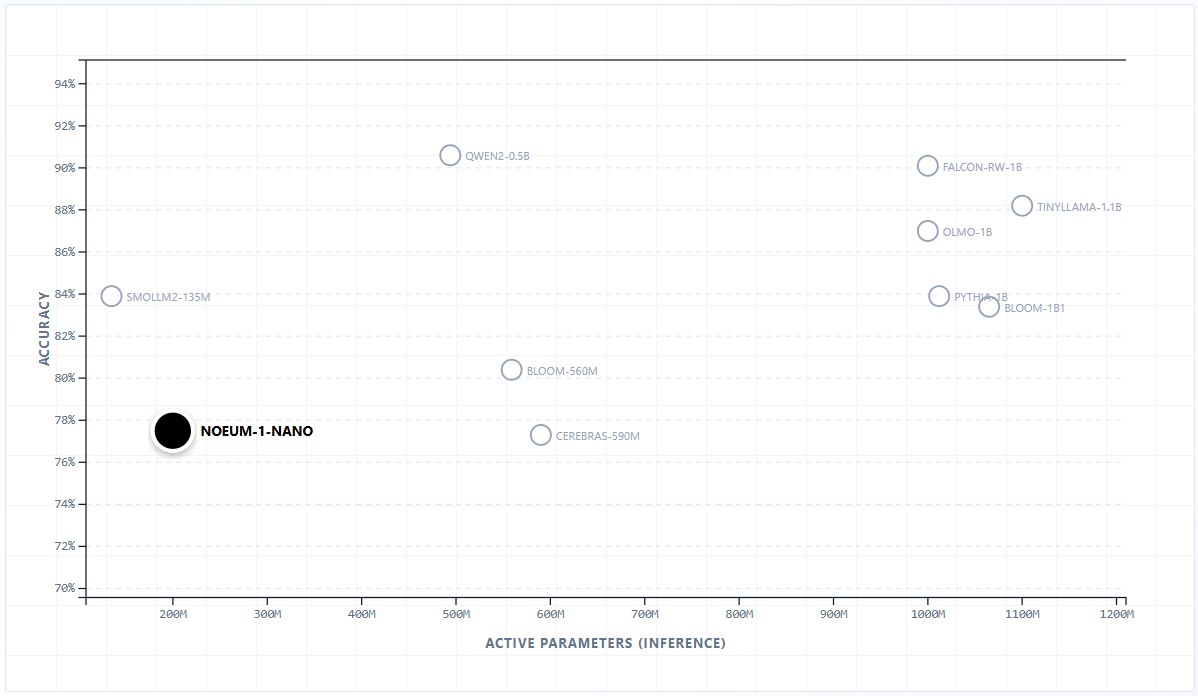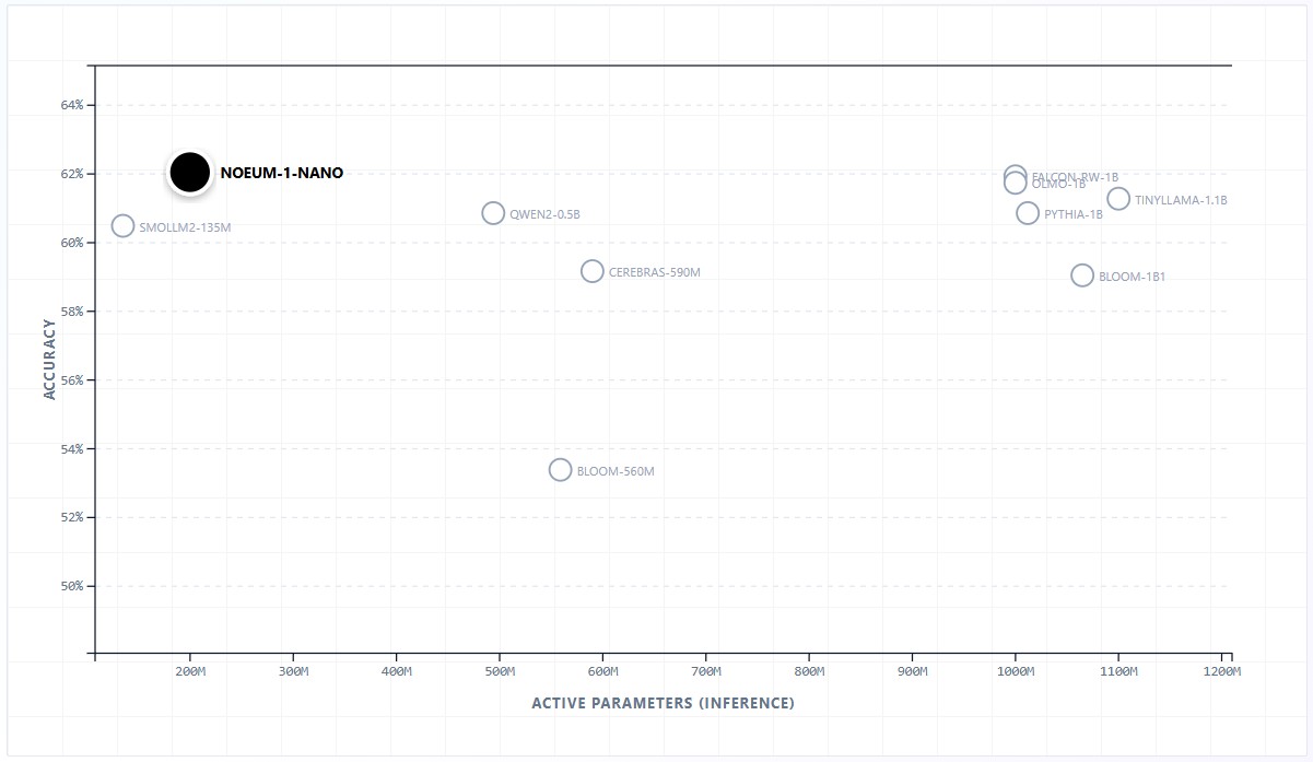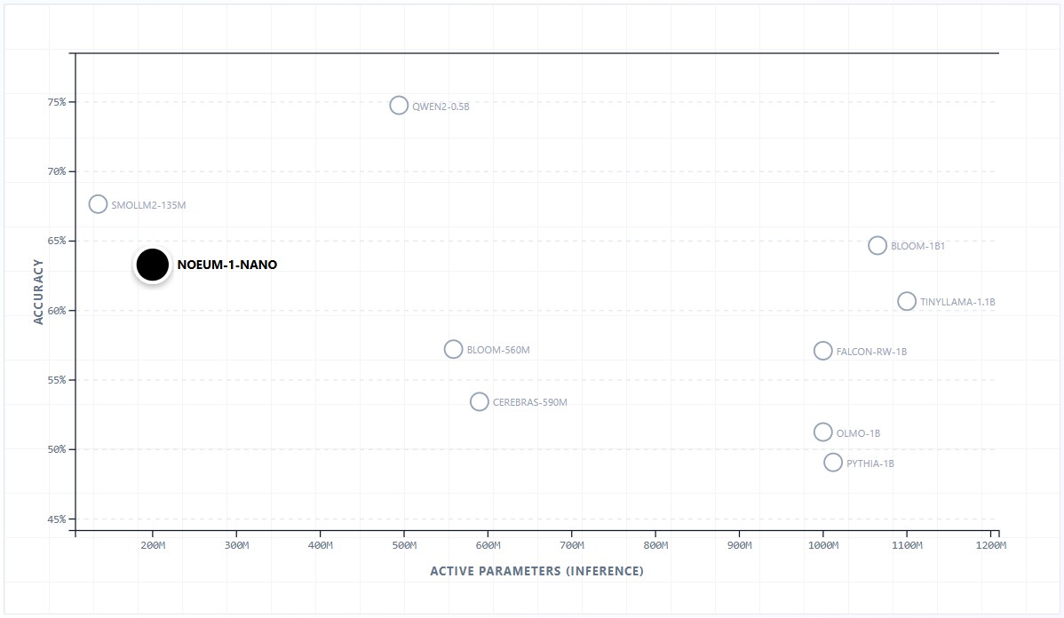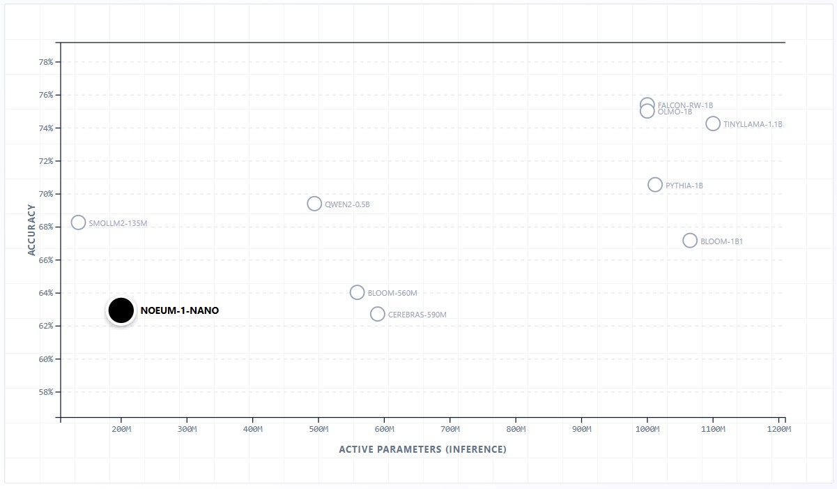 Noeum-1-Nano is a nano-scale Mixture-of-Experts (MoE) model (0.6B total / ~0.2B active parameters) trained from scratch on 18 billion tokens. It has proven its efficiency and reasoning quality by matching the capabilities of major labs’ nano-class models. Built entirely from scratch—with no pretrained weights and no inherited shortcuts—this independent effort demonstrates that innovative techniques and intelligent design ca deliver competitive capability and compete with brute-force scale.